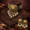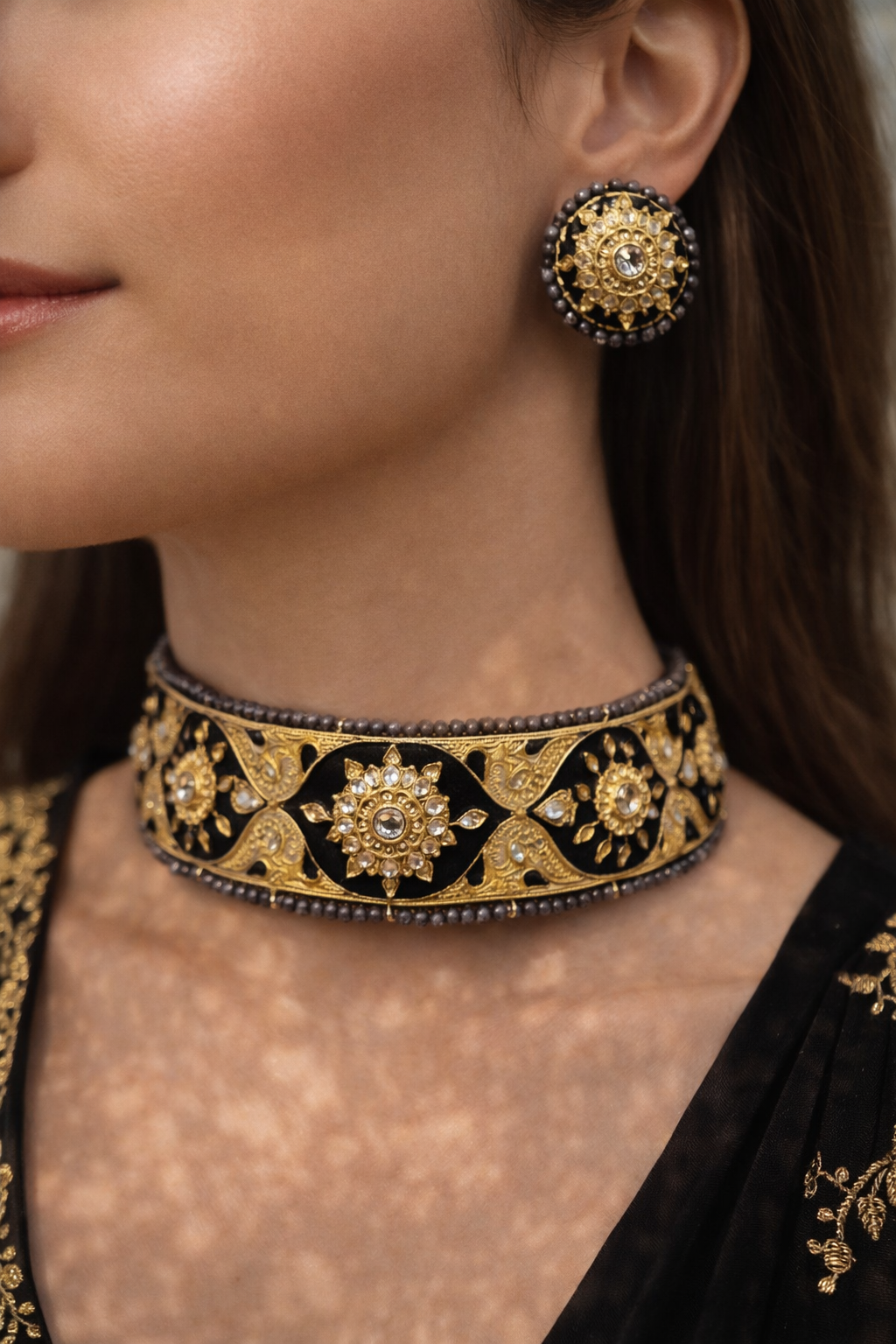 Gold meenakari choker with grey beads. Neckpiece + earrings, set on brass